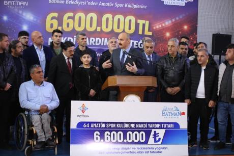 Batman Belediyesi olarak spora ve sporcuya verilen destekler aralıksız devam ediyor. Bu kapsamda 60 amatör spor kulübüne 90’ar bin TL, 4 engelli spor kulübüne ise 300’er bin TL olmak üzere toplamda 6 milyon 600 bin TL nakdi destek sağlandı.