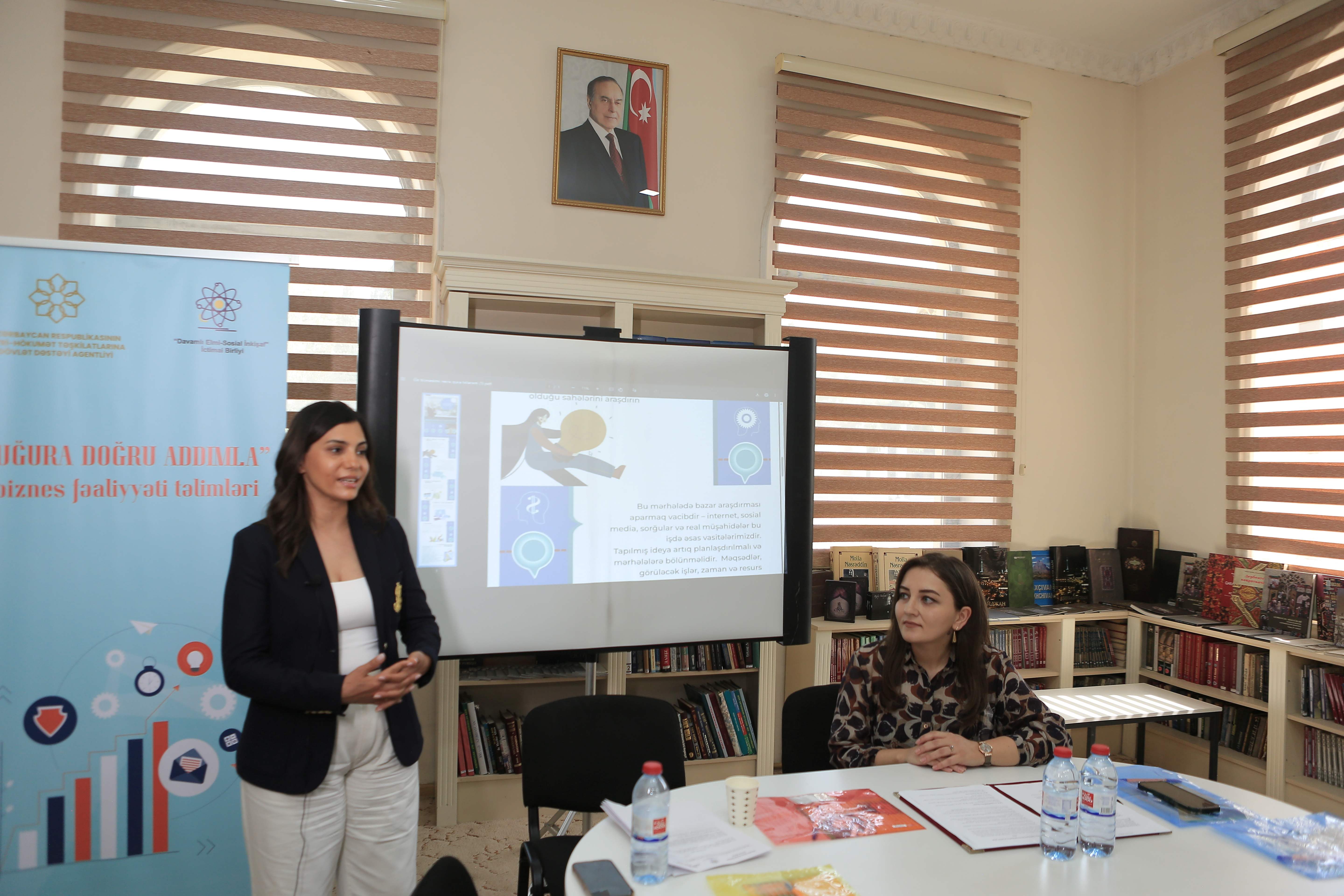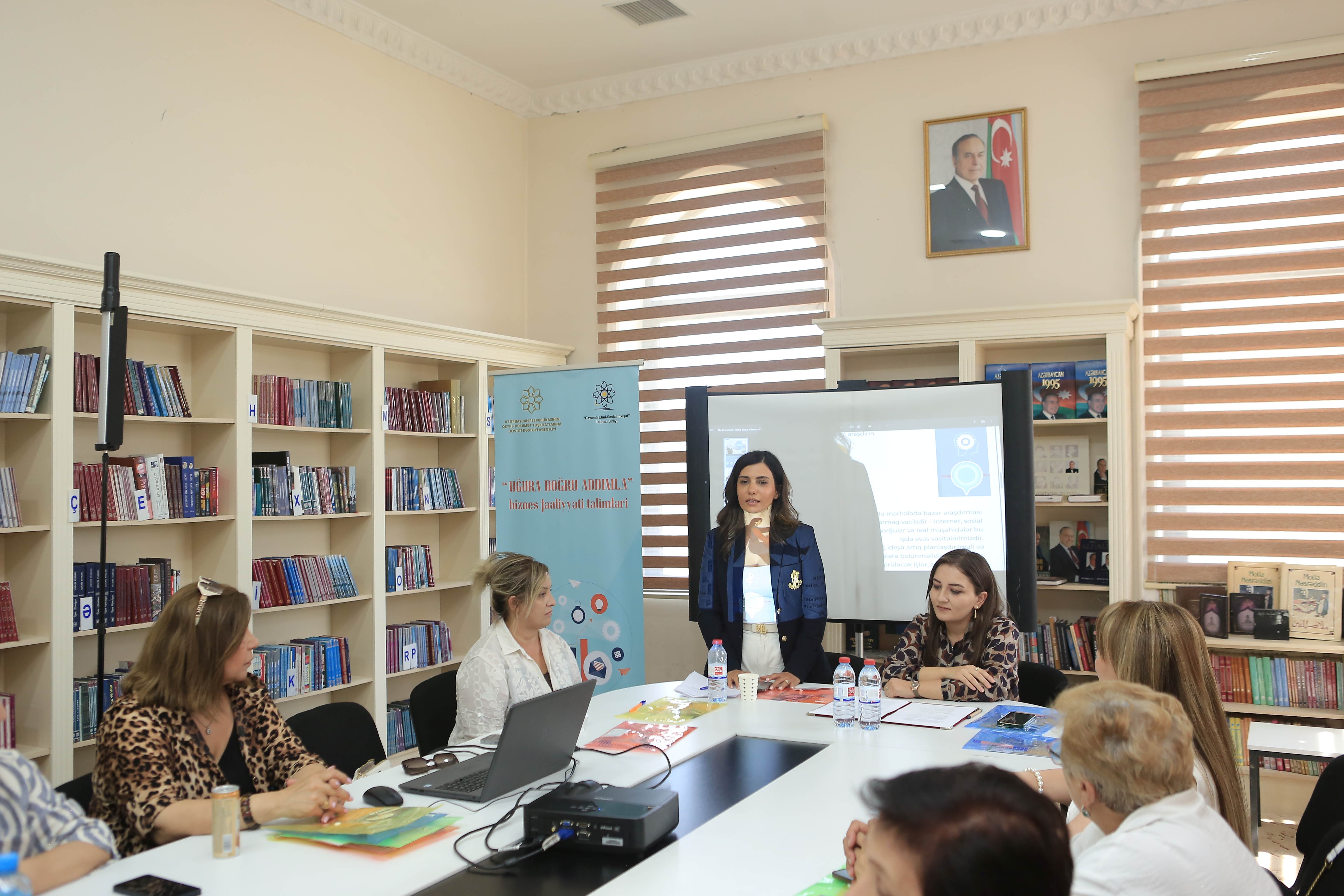 Gəncə şəhər Məhsəti Gəncəvi Mərkəzində “Davamlı Elmi-Sosial İnkişaf” İctimai Birliyi tərəfindən icra olunan “Uğura doğru addımla - biznes fəaliyyəti təlimləri” layihəsi çərçivəsində sahibkar kadınlar için eğitim düzenlenmiştir.