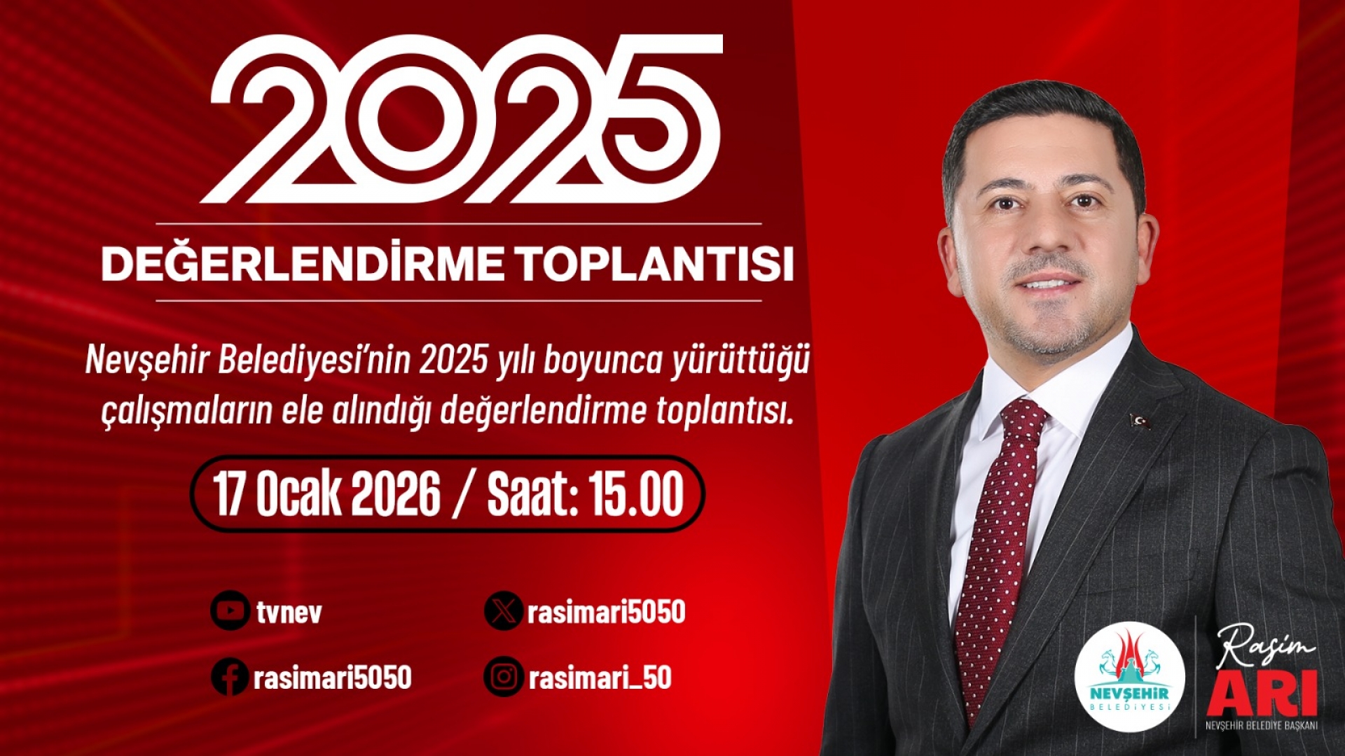 TvNev facebook dijital sayfası ve Belediye Başkanı Rasim Arı’na ait bütün sosyal medya platformlarından canlı yayınlanacak olan programda Nevşehir Belediyesi’nin 2025 yılı boyunca yürüttüğü çalışmalar geniş kapsamlı ele alınacak.