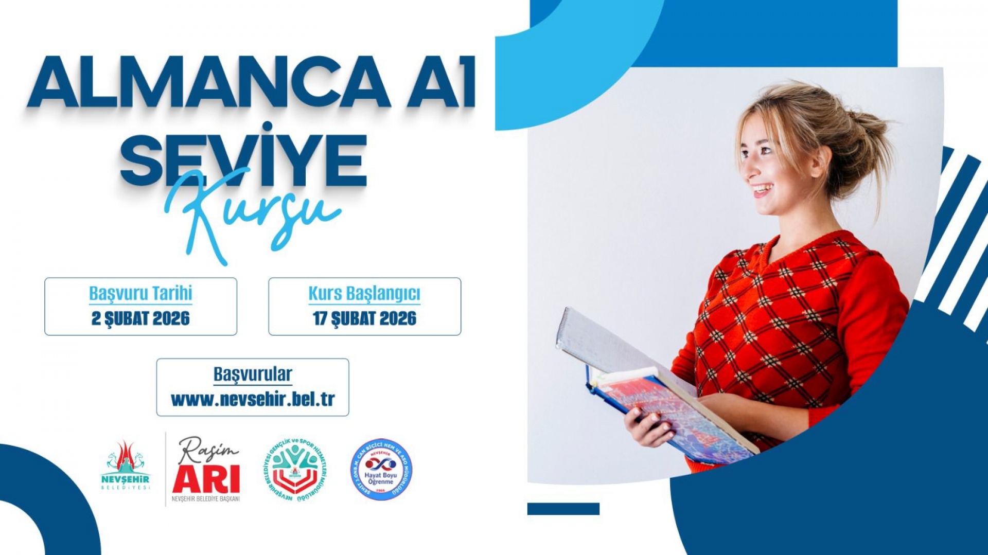 Almanca A1 Seviye Kursu; 02 Şubat 2026 tarihinde alınmaya başlanan başvurular sonrası kurs 17 Şubat 2026 tarihinde başlayıp 09 Nisan 2026 tarihinde tamamlanacak. Kurs Salı, Çarşamba ve Perşembe günleri 13.00 - 17.00 saatleri arasında yapılacak.