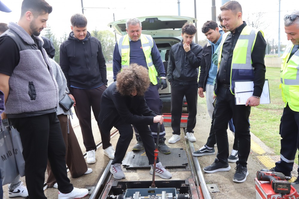 Teknik gezinin en dikkat çekici bölümlerinden biri ise uygulamalı eğitimler oldu. Öğrencilere sinyalizasyon ve makas sistemleri hakkında detaylı bilgiler verilerek, bu kritik altyapı unsurlarının nasıl çalıştığı uygulamalı olarak anlatıldı. Ayrıca tramvayların bakım süreçlerinden sefer planlamasına kadar pek çok teknik detay uzman ekipler tarafından paylaşıldı.